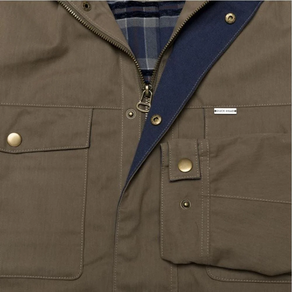 Its elevated touches include a soft flannel interior with nylon-lined sleeves for easy on and off, antique brass 2-way zipper, a water repellent finish, and side entry pockets.